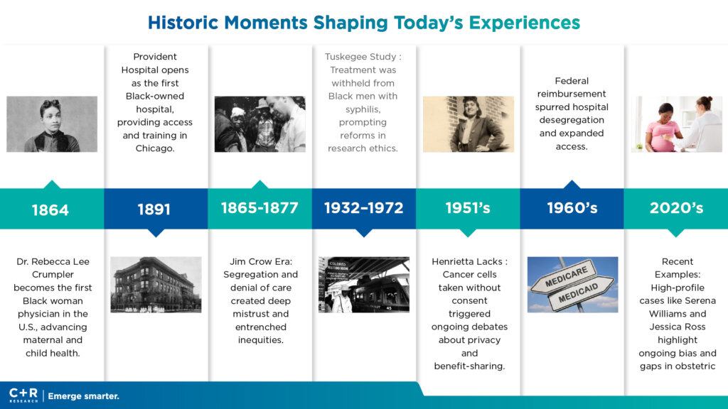 This month, we’re partnering across C+R’s Multicultural and Healthcare specialties to spotlight an issue drawing intensified national attention: healthcare experiences in the Black/African American community. From rising premiums and coverage churn to widely shared patient stories—like recent incidents where Black mothers in active labor were delayed or turned away, resulting in dangerous births outside of proper care like Mercedes Wells and Kiara Jones—these are not isolated events or “new” phenomena. They’re the latest chapters in a long, intergenerational history of mistrust, unequal treatment, and structural barriers that continue to shape how Black/AA consumers engage with the U.S. health system today.